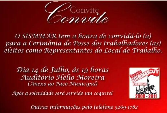 Hoje acontecerá a posse dos Representantes por Local de Trabalho, às 19 h no auditório Hélio Moreira, no Paço Municipal. A diretoria do SISMMAR tem a honra de convidar a todos (as) trabalhadores (as) para este evento que marca o cumprimento de mais uma ação da Plataforma de Governo da Gestão “Pra Mudar” 2008-2011.